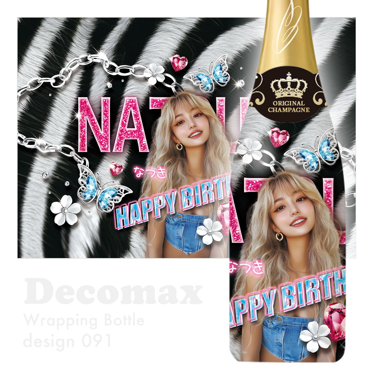 写真や名前を入れて作る、360度フルラッピングのオリジナルシャンパン。